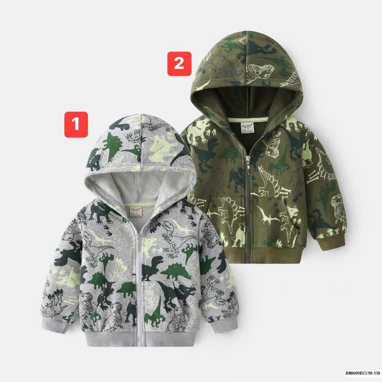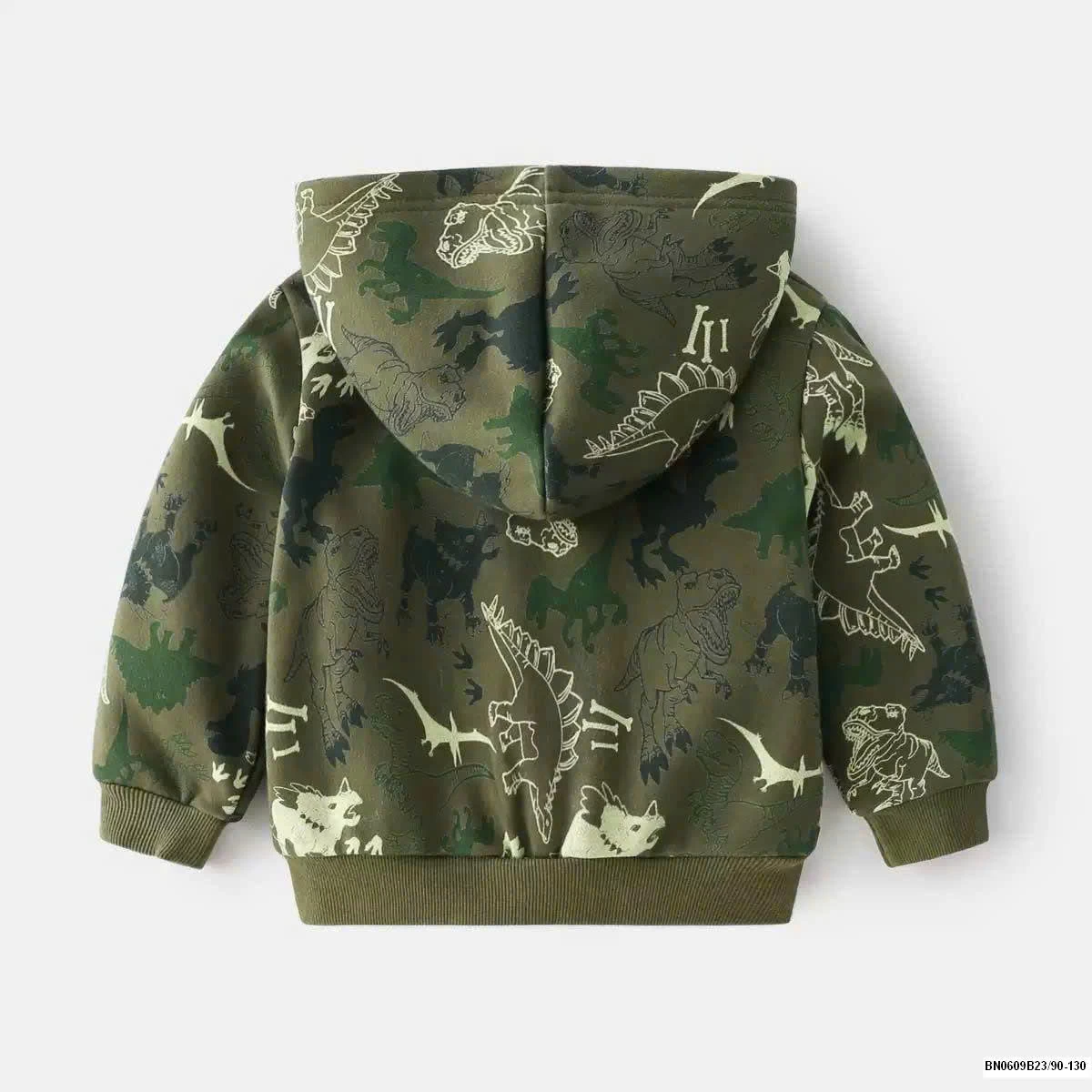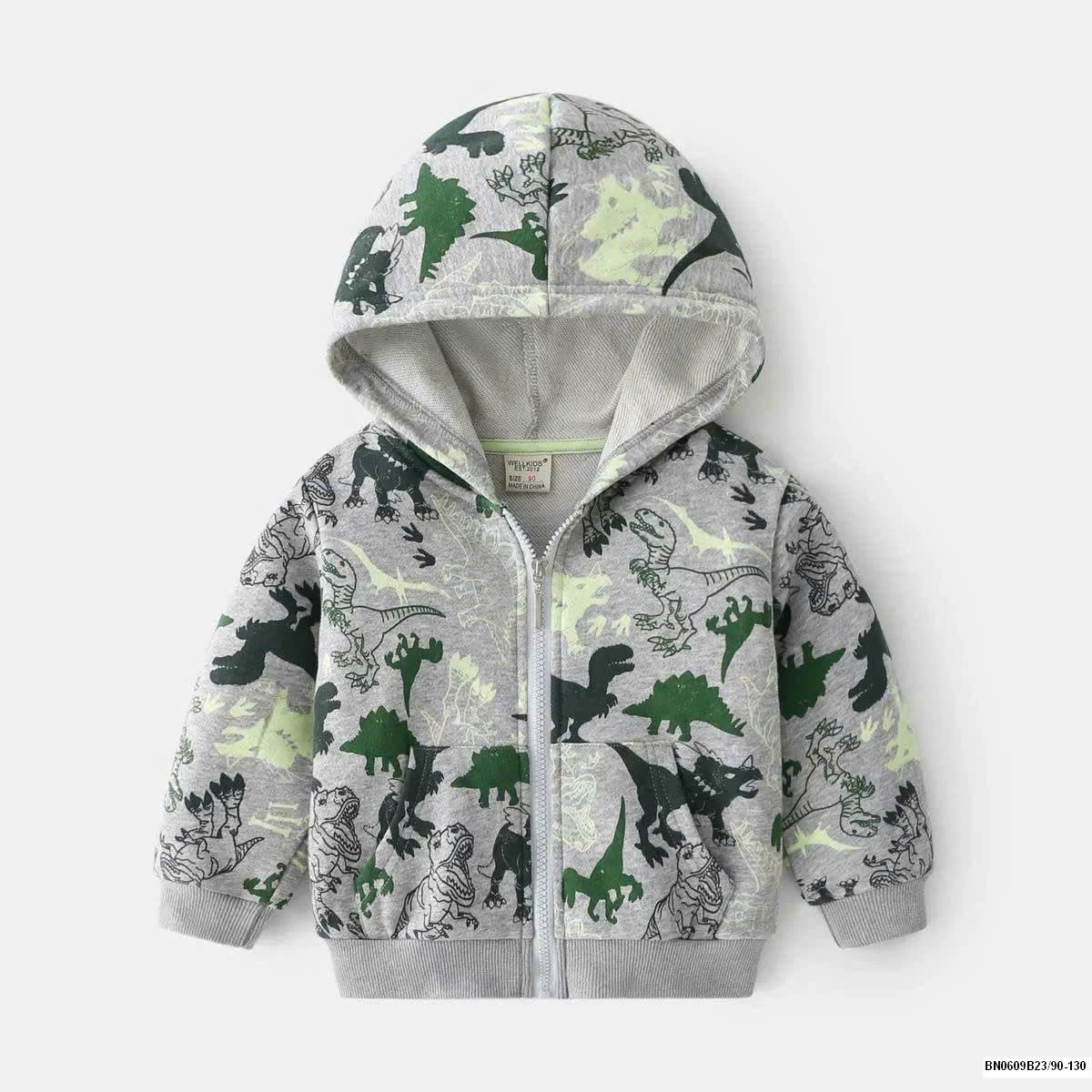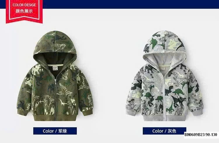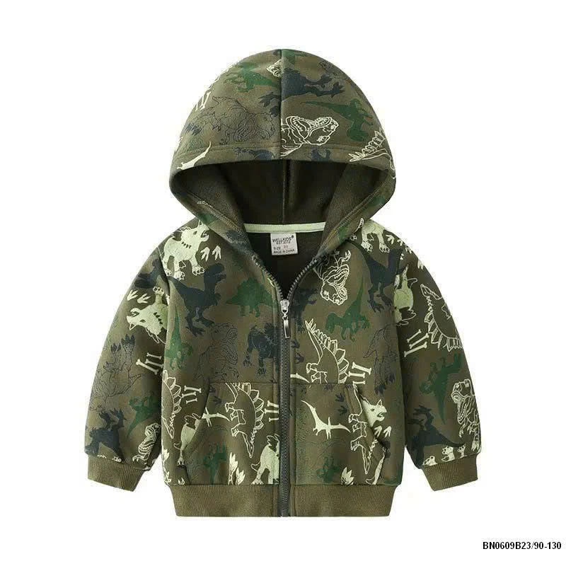 Áo khoác nỉ khủng long có mũ cho bé trai rất đẹp, chất nỉ mềm mặc rất thích.