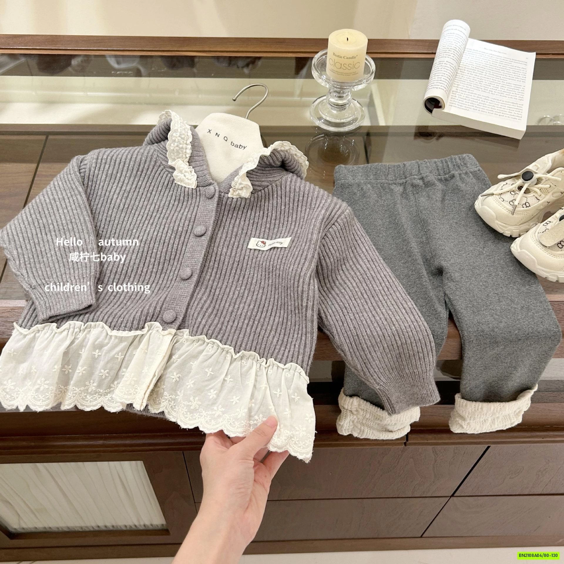 Khoác nỉ len viền ren liền mũ cực xinh, dễ thương, phối cùng quần ton-sur-ton cho bé diện mùa thu đông.